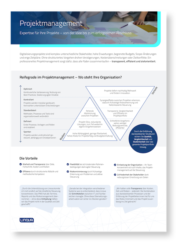 Eine durchdachte Zeit- und Ressourcenplanung sowie die Identifikation möglicher Risiken legen die Grundlage für ein kontrollierbares Projekt. Standardisierte Prozesse, Methoden und Werkzeuge erhöhen die Vergleichbarkeit und reduzieren Reibungsverluste.